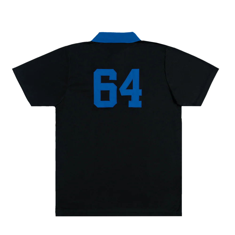 Generations collide as the 1960's meet the 1990's and the uniform of the world's most popular sport gets the full Mod treatment. Varsity style typography plus the iconic target make this black polo shirt featuring royal blue details a complete show-stopper.